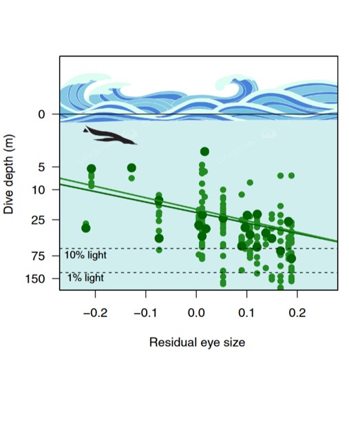 I examined the ecological correlates of eye size for 1/3 of the global aquatic avifauna (~450 species). One of the most amazing findings related to underwater pursuit divers (like auks and penguins). Species that dove to greater depths where light attenuates to < 1% had larger relative eye sizes, indicating that underwater light environments have contributed to eye size evolution.